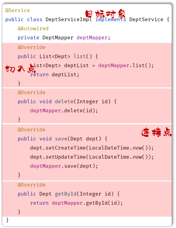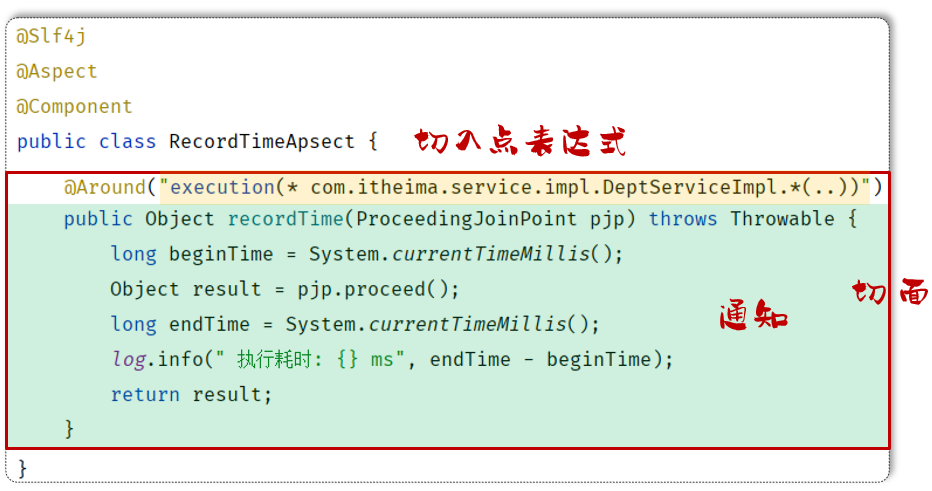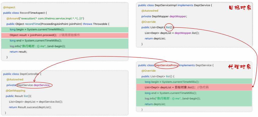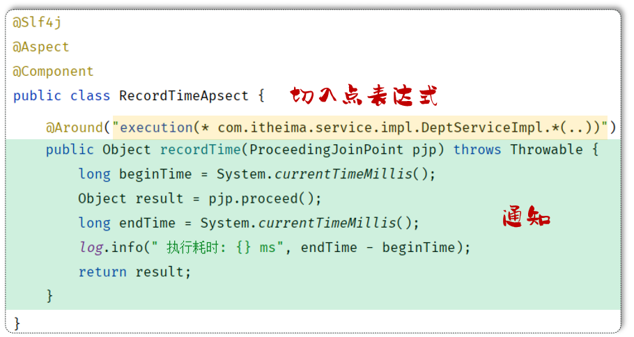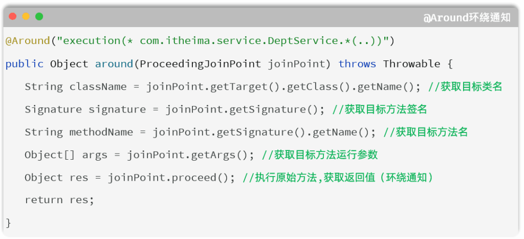 ProceedingJoinPoint.proceed()来让原始方法执行,其他通知不需要考虑目标方法执行 - @Around环绕通知方法的返回值,必须指定为