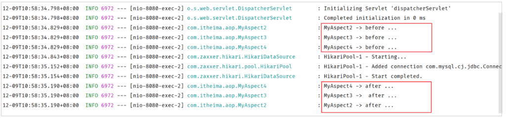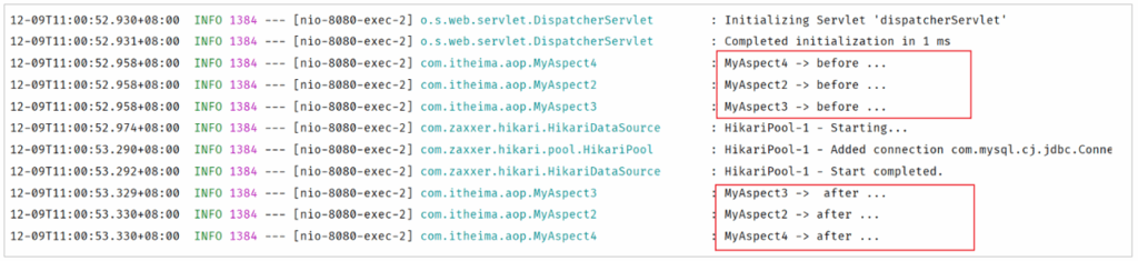 当定义了多个切面类,而多个切面类中多个切入点都匹配到了同一个目标方法时,这些切面内的通知方法都会执行,执行顺序默认按照切面类的类名字母排序: