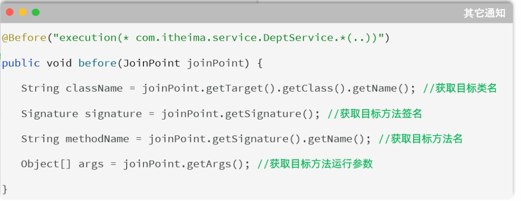 在Spring中用JoinPoint抽象了连接点,用它可以获得方法执行时的相关信息,如目标类名、方法名、方法参数等。